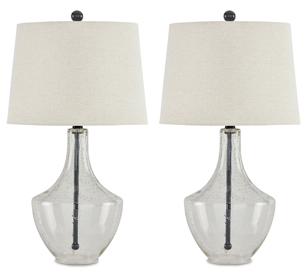 Simple yet elegant, this table lamp sets the scene for high style. Crafted of metal in a fashionable finish, this pair of lamps feature a straight post body enhanced in curvaceous seeded glass. Up top, a modified drum shade with beige fabric adds textural interest. With its curved lines and simple elegance, this delightfully versatile lamp brings an upscale touch to mid-century modern and contemporary interiors.