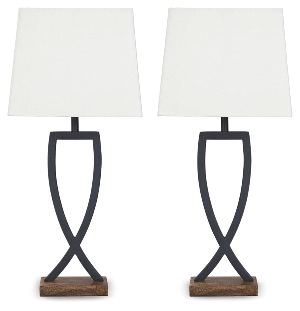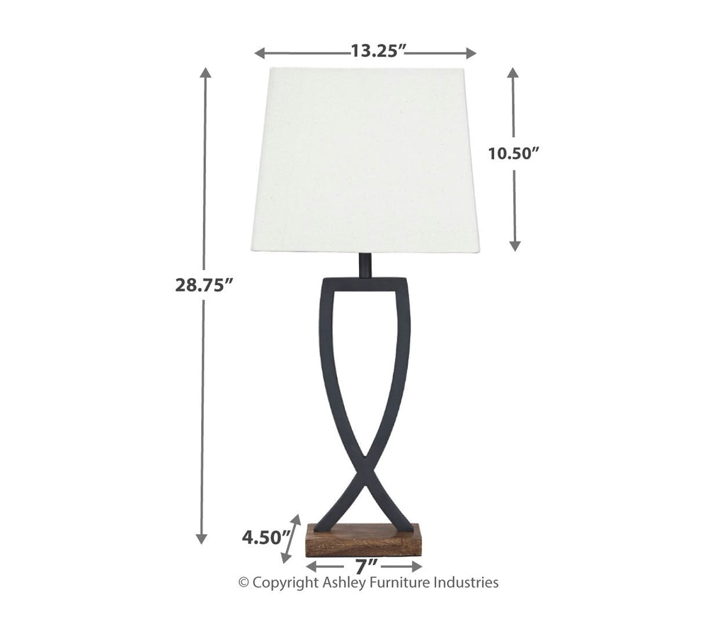 This table lamp is an enticing merge of mixed materials. Textured black finished metal stands poised atop a block of warm brown wood. Open design is right at home among casual decor.