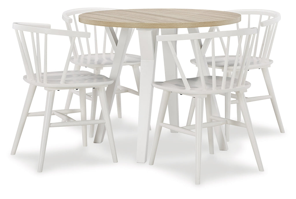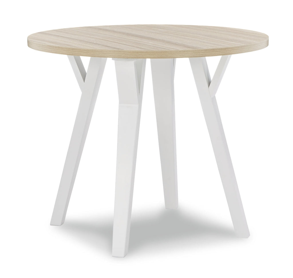 Bring light to your dining area with the clean lines and bright two-tone finish of this dining package. The rectangular dining table, with stylized saber legs in a white finish, matches the spindle-back chairs for beautiful simplicity. The table’s melamine top, in a light tan color, provides additional durability, marrying minimalism with big style for a delightful combination.