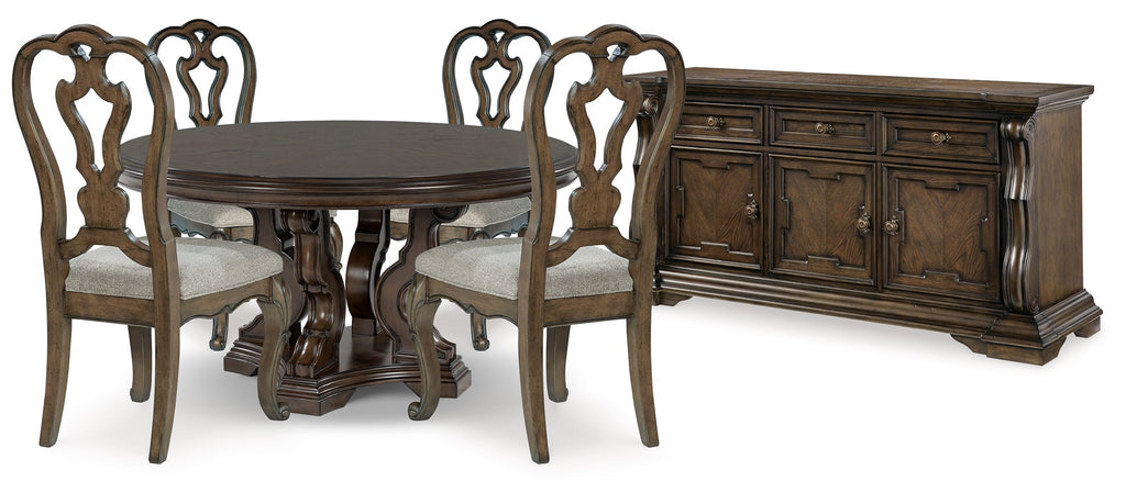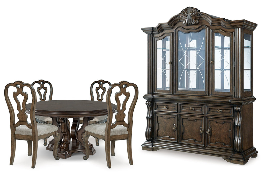 From its ornamental appliques to its large scale, this dining package makes a bold statement. With ornate details, the opulent set wows with stunning style. The look is timeless. The feel? Right at home.