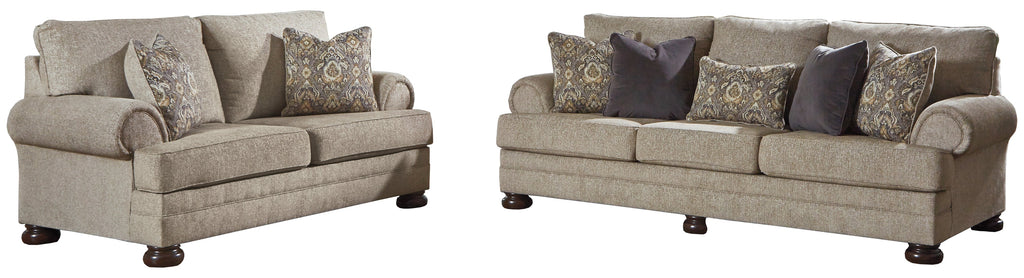 This sumptuously styled sofa and loveseat prove that a richly traditional look doesn’t have to break the bank. Flared effect gives the classic roll arms a relaxed feel, while the choice of a plush chenille upholstery in oatmeal is earthy elegance at its best. Distinctively turned bun feet in a dark finish add to this furniture set’s substantial presence.