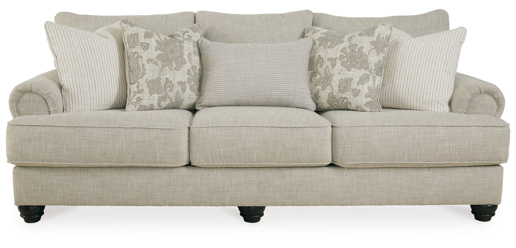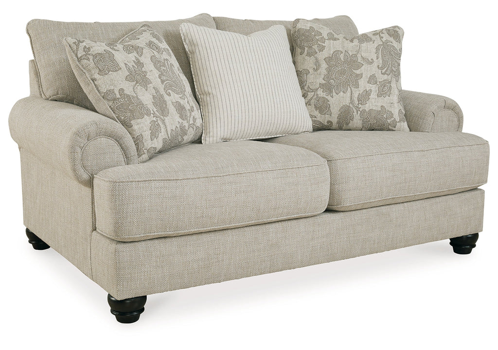 This sofa and loveseat package has an alluring look that's guaranteed to turn heads. Richly textured fabric in a light, easygoing hue is enhanced by even lighter flax peeking through. Distinctive roll arms add a dab of debonair, while indulgently plush cushions cradle you softly. Sit back and relax in comfort and style, with plenty of room to stretch out and unwind at the end of a long day.