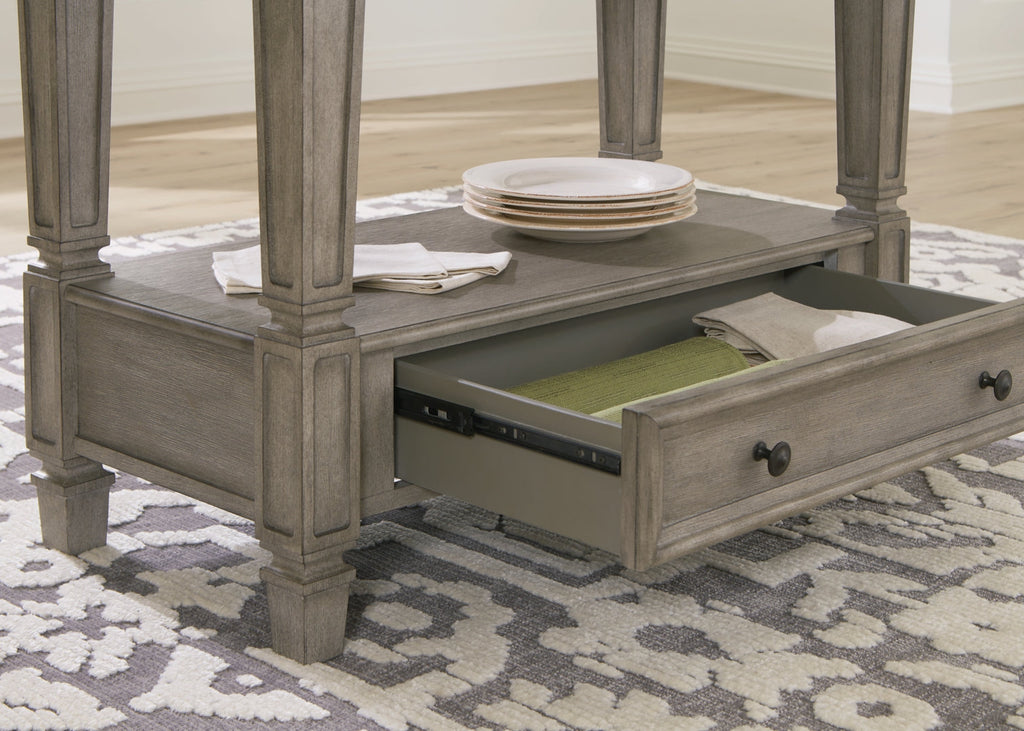 Understated beauty. Subtle function. This counter height dining table recalls traditional aesthetics while suiting modern needs. Work-from-home or homework materials cluttering the tabletop before dinnertime? Stow them (and other everyday essentials) in the open shelf and lower drawer to free up counter space. With this table, your multi-use dining area gets a simple yet stylish upgrade.