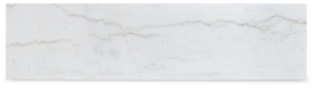 This sofa table is simple in design but big on style. Finished with a trend-right grayish brown wood tone, its bold, blocky profile and natural marble top are timeless classic choices that is ideal for pairing with an ottoman underneath to pull extra seating into the room or remaining clean and sleek on its own. Adding to its beauty, the marble top's color variations, fissures, mineral deposits and veining are naturally formed and are not defects.