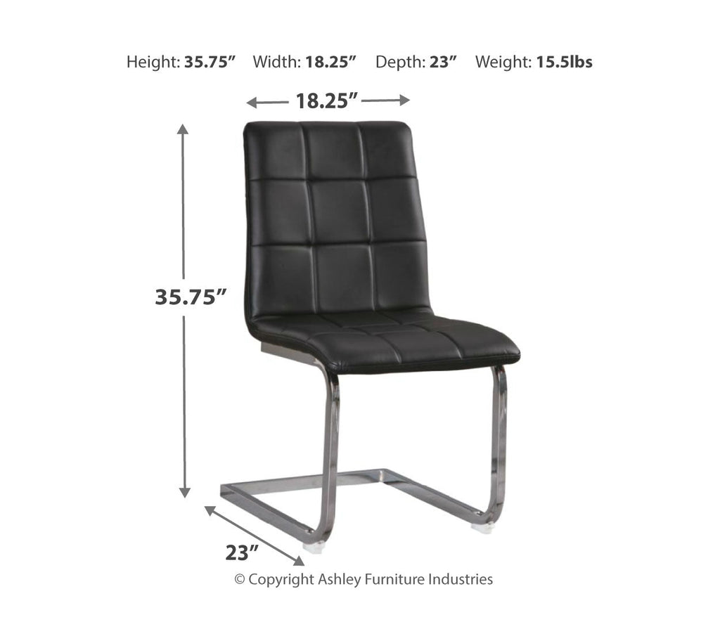 Wowing with a slim but sturdy profile and sculptural C-frame design, this dining room upholstered chair is sure to whet your appetite for ultra-contemporary style. Comfortably contoured seat is covered in a fabulous black faux leather with subtle grid tufting. Metal frame’s chrome-tone finish contrasts with a high-sheen effect.