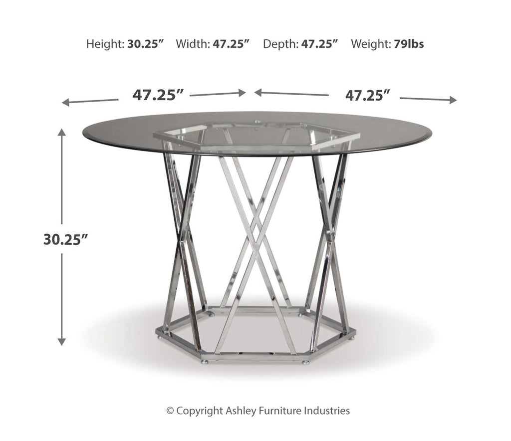 Wowing with an open and airy but sturdy profile, this round dining room table is sure to whet your appetite for ultra-contemporary style. Sporting a chrome-tone finish for a high-sheen effect, the hexagonal metal base is striking from every angle. Clear glass top rounds out the look with sheer simplicity.