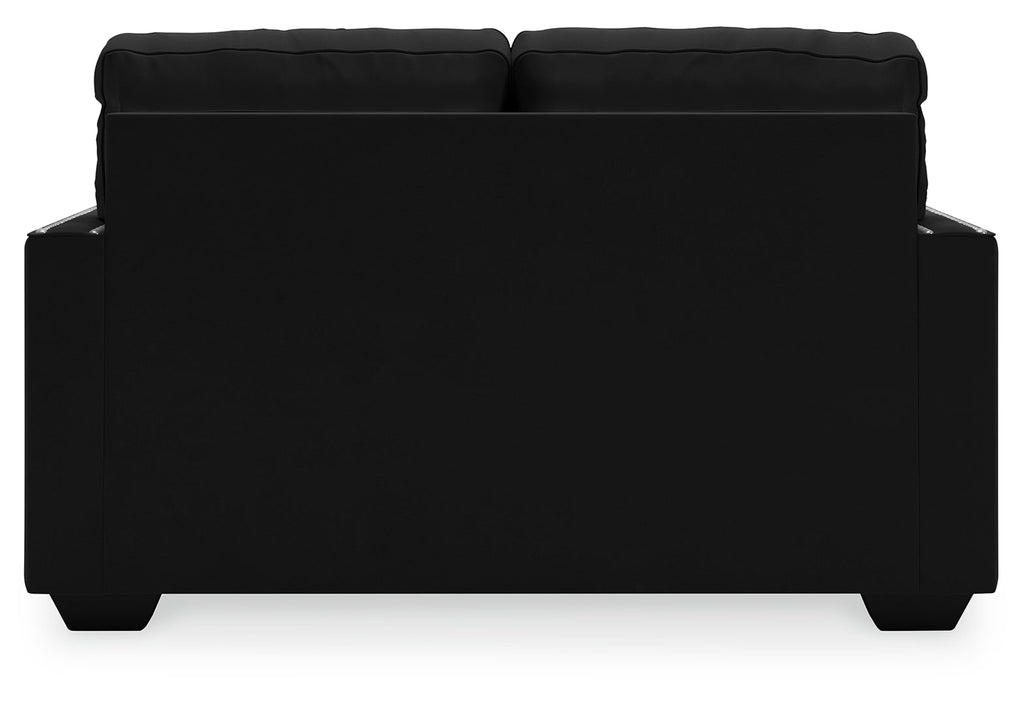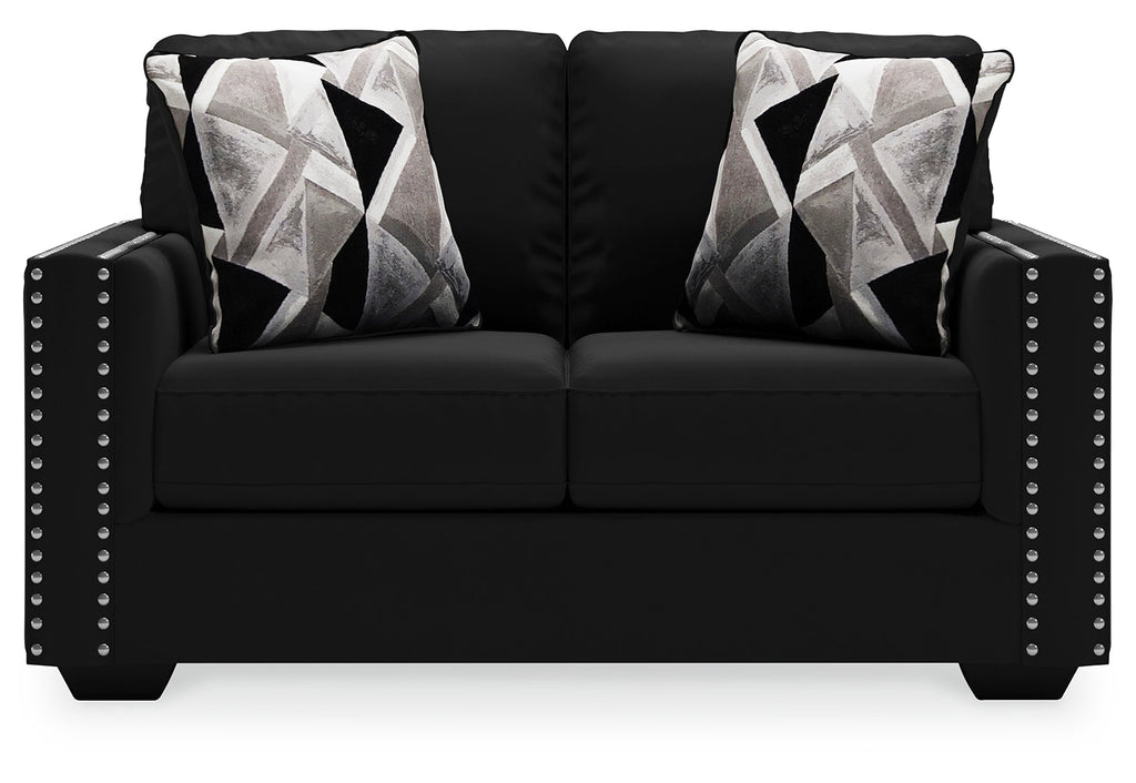 Raise your standard of living with this loveseat in onyx black. Reserved exclusively for those with a penchant for high-glam home decor, this ultra-chic loveseat is dressed to impress with a clean-lined profile, 2-over-2 cushion styling and sleek track arms punctuated with nailhead trim. Easy on the eyes and alluring to the touch, this decidedly contemporary loveseat is covered in a low-pile soft velvet that’s impossible to resist. Abstract-patterned throw pillows enhance the posh appeal.