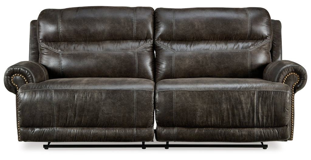 In charcoal gray, this 2-seat power reclining sofa with adjustable headrest offers the warm feel of fabric and the cool, rustic look of leather. Caressing you in comfort, the faux leather dual-sided recliner features luxurious bustle back cushions, plus jumbo window-pane stitching and nailhead trim for style. Easy View™ power adjustable headrests offer a primo view of the TV even when you're fully reclined, to enhance your relaxation. Chill out while you recharge thanks to a USB port built right into the one-touch power control.