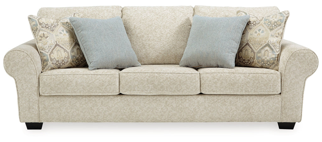 Blending classic elements like sumptuous flared roll arms with tailored box cushions and tapered black feet for up-to-date appeal, this sofa exudes that transitional aesthetic that looks and feels right at home. Offering plenty of room for everyone to make themselves comfortable, this large-scale sofa is wrapped in a soft, chunky weave fabric loaded in texture. Light and lovely ivory upholstery makes for such an easy-breezy blend.