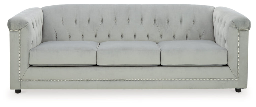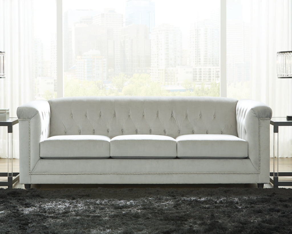 With a timeless classic Chesterfield styling that's very much in vogue, this sofa makes a brilliant statement. Its beautifully neutral silvery gray velvet fabric looks as good as it feels. Nailhead trim, button tufting and high shelter arms give the sofa an effortlessly elegant appeal. The hidden leg design is an on-trend addition for modern spaces.