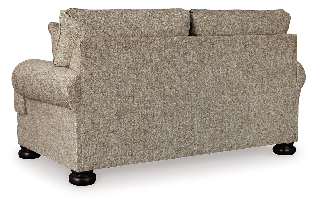 This sumptuously styled loveseat proves that a richly traditional look doesn’t have to break the bank. Flared effect gives the classic roll arms a relaxed feel, while the choice of a plush chenille upholstery in oatmeal is earthy elegance at its best. Distinctively turned bun feet in a dark finish add to the loveseat's substantial presence.