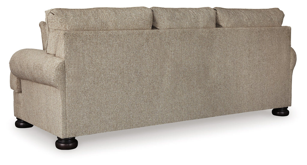 This sumptuously styled sofa proves that a richly traditional look doesn’t have to break the bank. Flared effect gives the classic roll arms a relaxed feel, while the choice of a plush chenille upholstery in oatmeal is earthy elegance at its best. Distinctively turned bun feet in a dark finish add to the sofa's substantial presence.