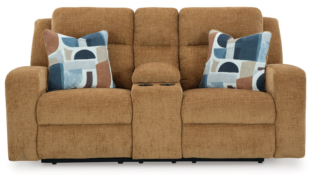 Indulgent comfort meets fashion-forward flair in this reclining loveseat with console. Its luxuriously soft upholstery and captivating color show off your cozy yet smart style. Sleek track arms infuse a modern sensibility, while the striking accent pillows make this piece even more inviting. Simple pull tab reclining puts endless relaxation within easy reach, whether you're lounging solo or with friends. Cup holders and hidden storage complete the experience.
