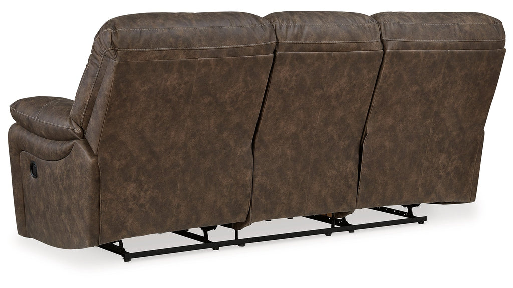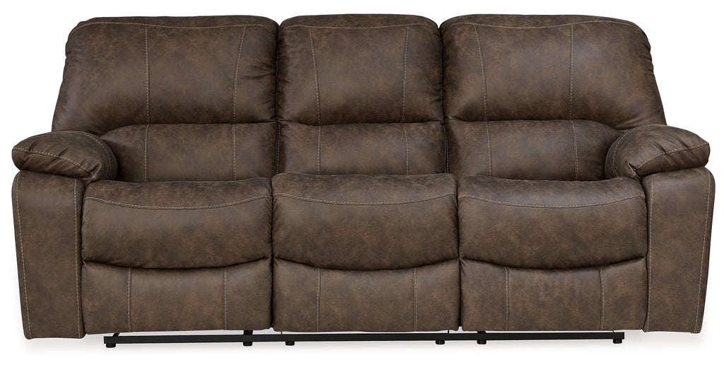 Living room lounging, with a touch of simply stunning character. This reclining sofa seamlessly complements your contemporary cozy space. Accented by jumbo stitching, the versatile chocolate faux leather is a tried-and-true approach to everyday style. And with only a simple pull needed to extend the recliner on either side, this piece proves homey, inviting design and superb comfort go hand in hand.