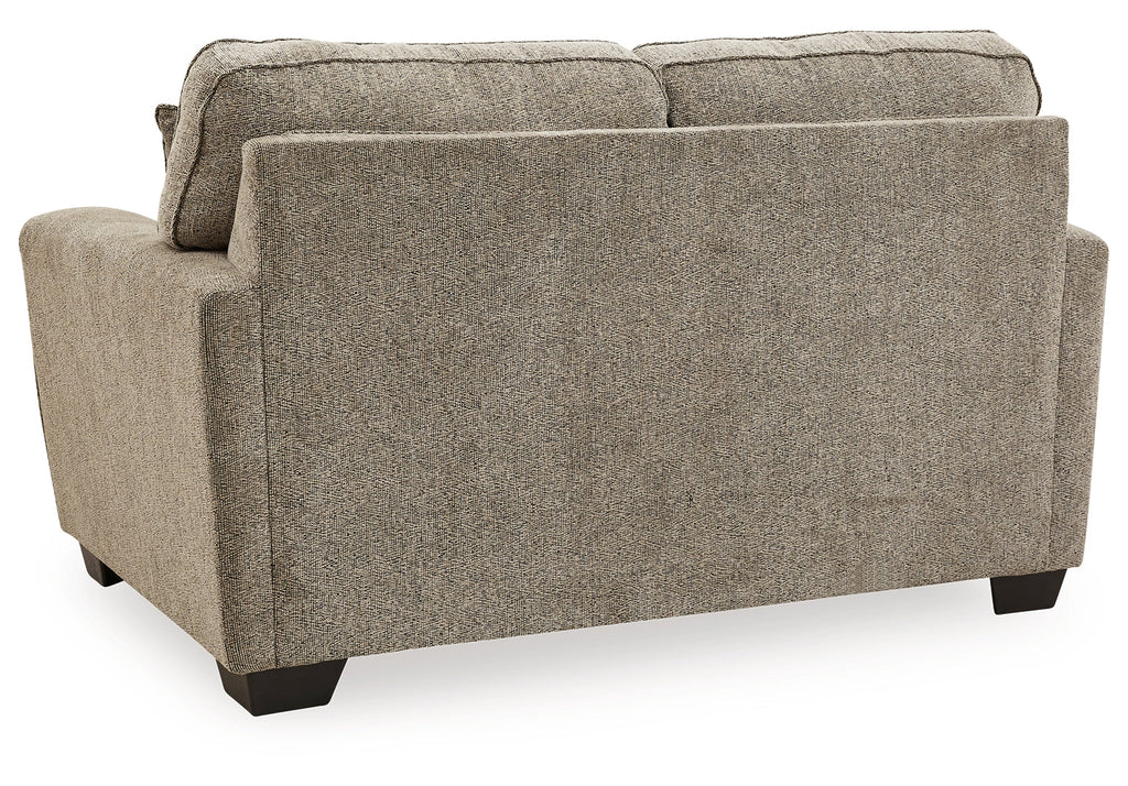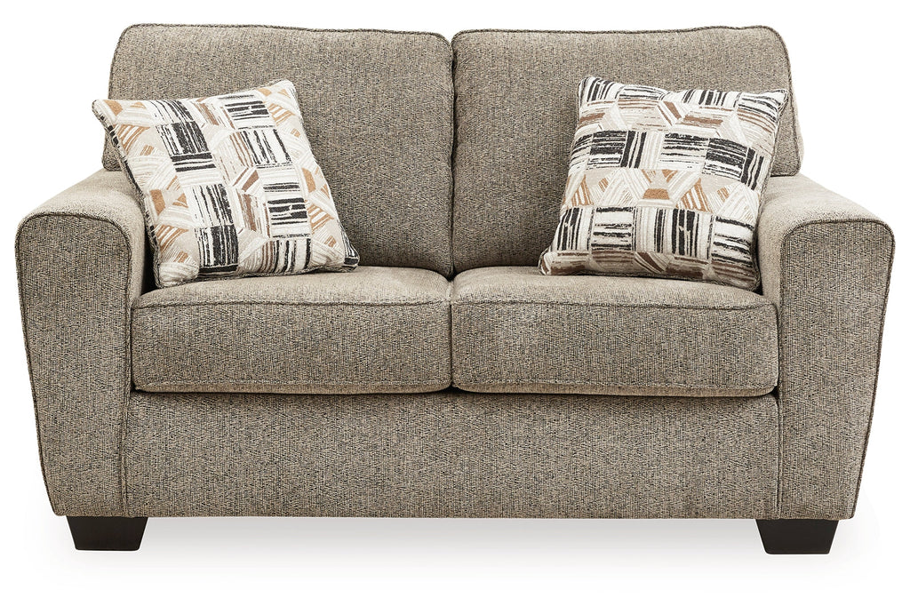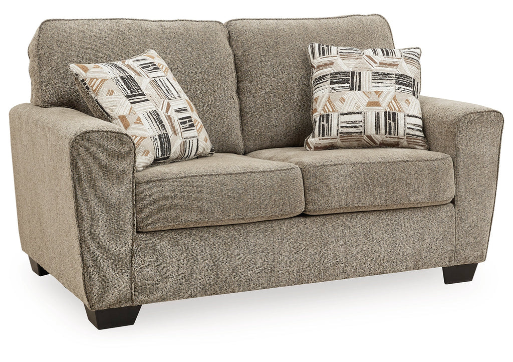 For seating that feels as good as it looks, the choice is clear. This loveseat has a neutral mocha hue that blends effortlessly with any room decor and color scheme. Its soft textured chenille fabric with chevron effect beckons you to sit and relax. Wide track arms elevate the look with a touch of contemporary sensibility, enticing you to settle in and stay awhile. Caramel and black toss pillows are a designer favorite.