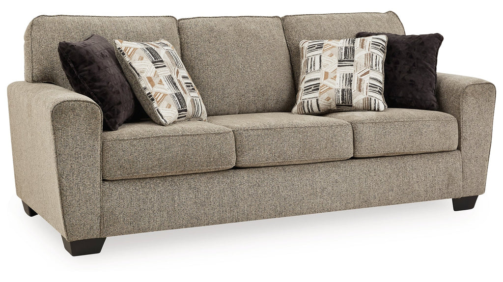 For seating that feels as good as it looks, the choice is clear. This sofa has a neutral mocha hue that blends effortlessly with any room decor and color scheme. Its soft textured chenille fabric with chevron effect beckons you to sit and relax. Wide track arms elevate the look with a touch of contemporary sensibility, enticing you to settle in and stay awhile. Caramel and black toss pillows are a designer favorite.