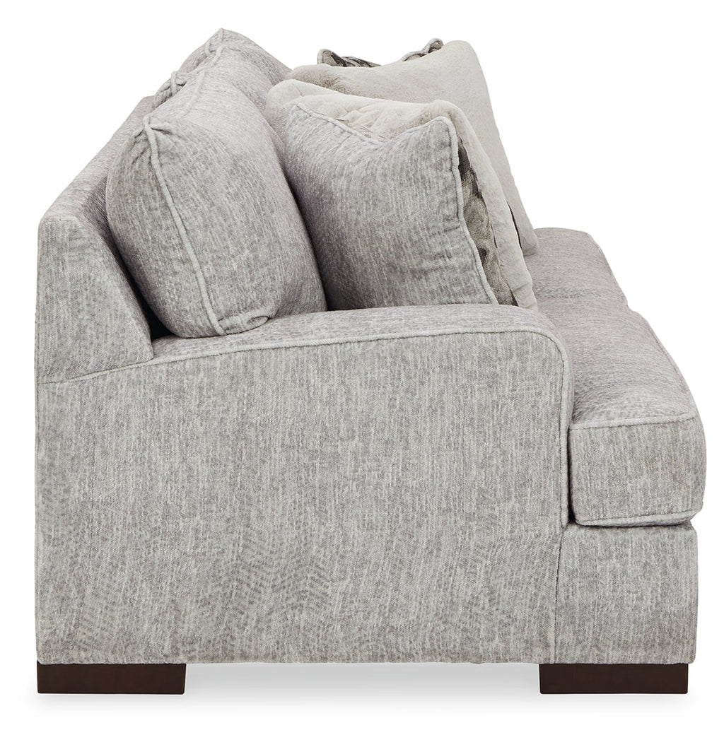 An indulgent choice with deep seats crafted for ultra-plush softness, this designer sofa is the ideal merger of modern flair and classic staying power. If you love a touch of texture, you’re sure to appreciate this sofa’s gorgeous gray upholstery with subtle chevron effect. Posh toss pillows layered over the loose back cushions perfect the richly relaxed aesthetic.