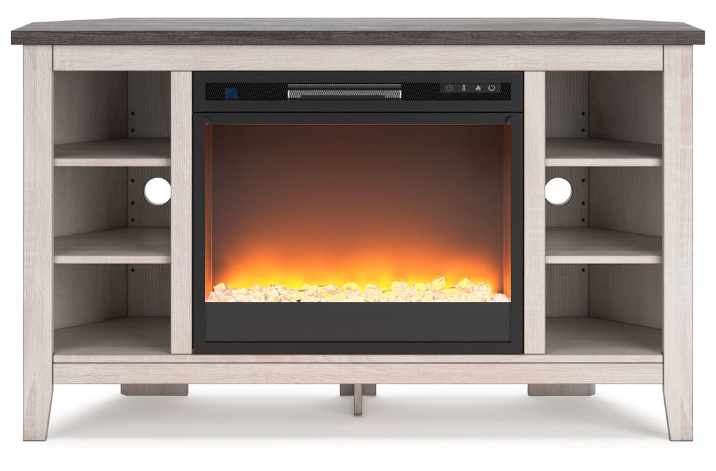 With its minimalist charm, this corner TV stand is right in tune with your relaxed approach to high style. Beautifully shaped to nestle into any corner, it’s well equipped with a flexible, open-concept design and cutouts for wire management that enhance the clean-lined aesthetic. Adding that much more show-stopping style, the electric fireplace insert operates with or without heat and includes a six-level temperature setting, a remote control and an overheating control for added safety. It comes with faux glass crystals and natural stones, so you can customize the look of the flame bed.
