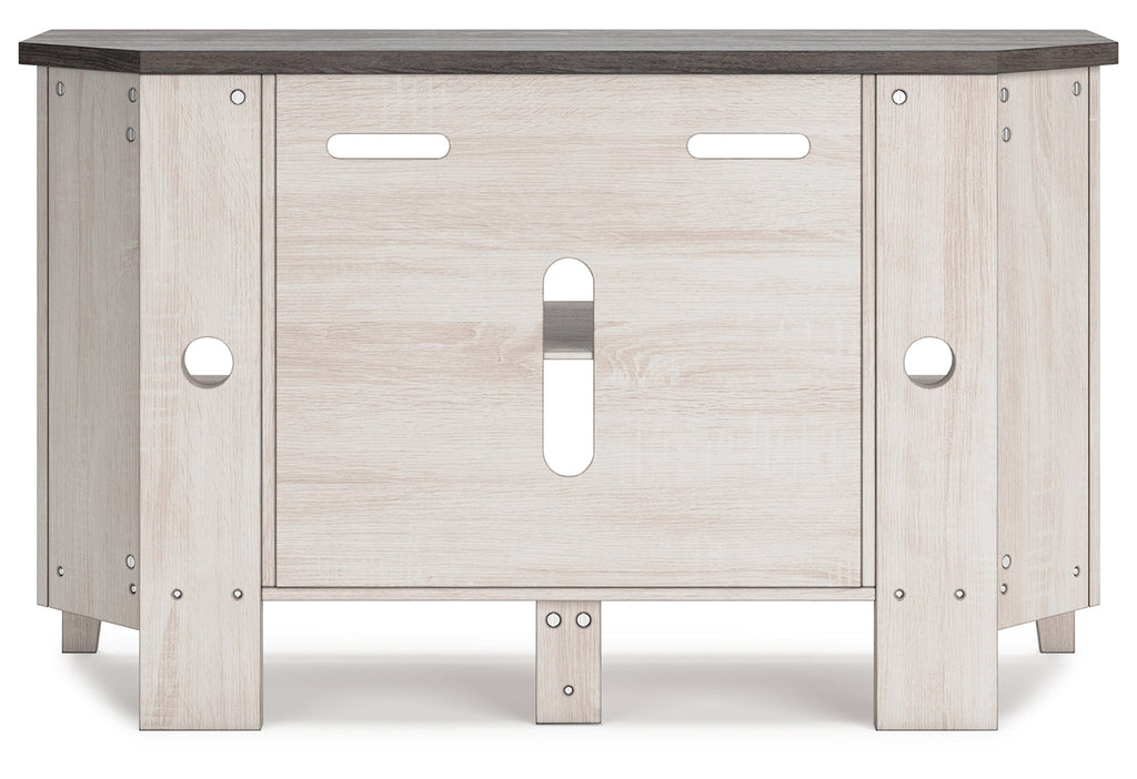With its minimalist charm, this TV stand is right in tune with your relaxed approach to high style. Beautifully shaped to nestle into any corner, it’s well equipped with a flexible open-concept design and cutouts for wire management that enhance the clean-lined aesthetic. The look is ideal for modern farmhouse and contemporary settings.
