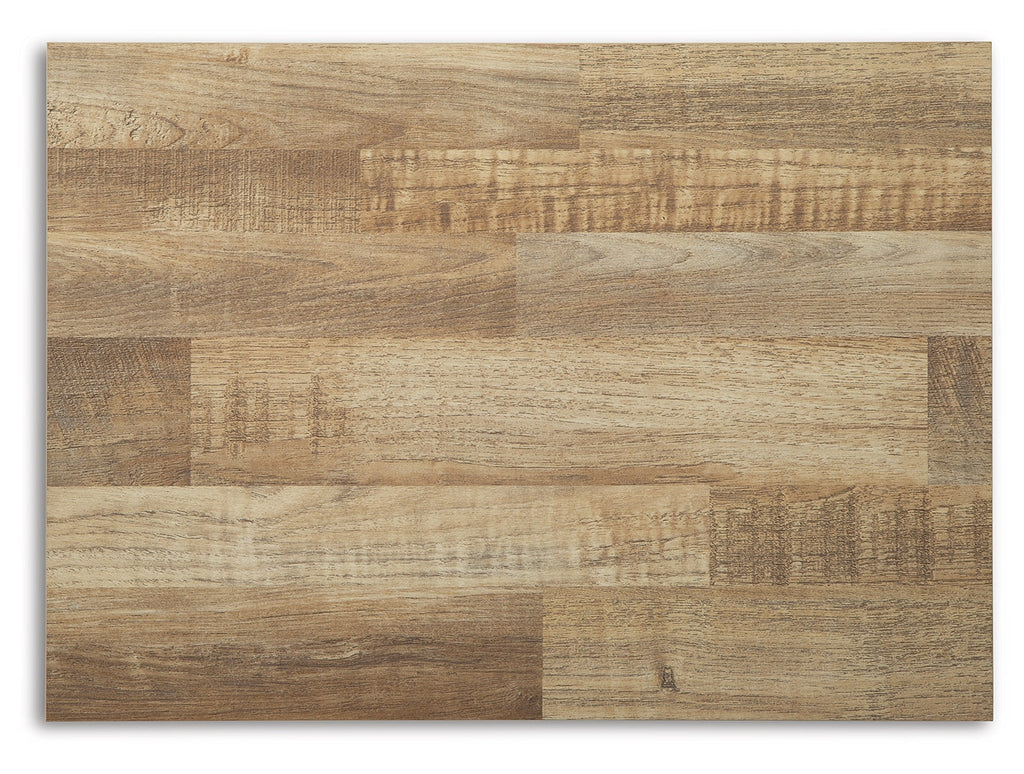 - Made of decorative laminate and engineered wood with tubular metal bases