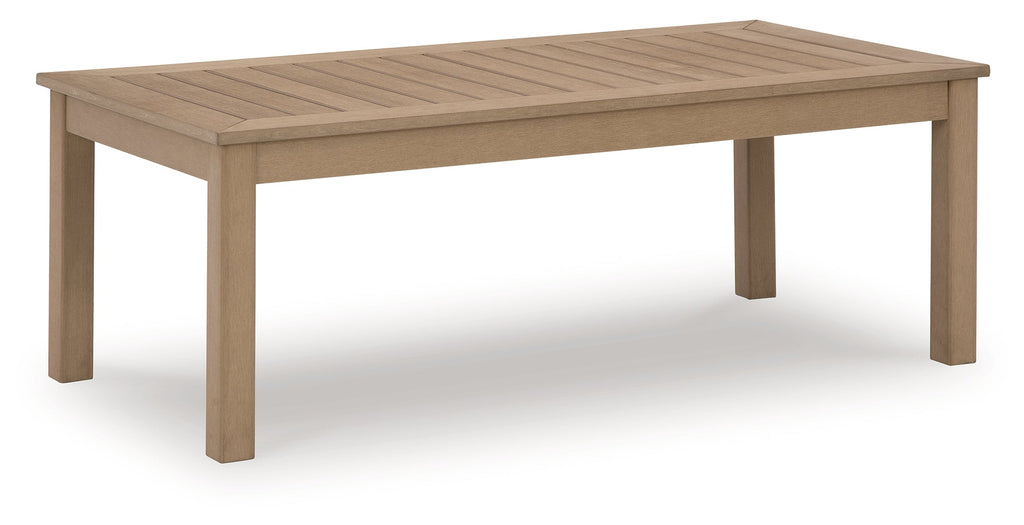This coffee table is a beautiful addition to any outdoor living space. Effortless in its simplicity, this piece echoes your easygoing sensibilities. Combining durable, cutting-edge engineered materials, its Weatherwood construction in a blond wood color enhances the contemporary design. Pair this table with the matching sofa and chairs for a spectacular backyard or patio seating arrangement.