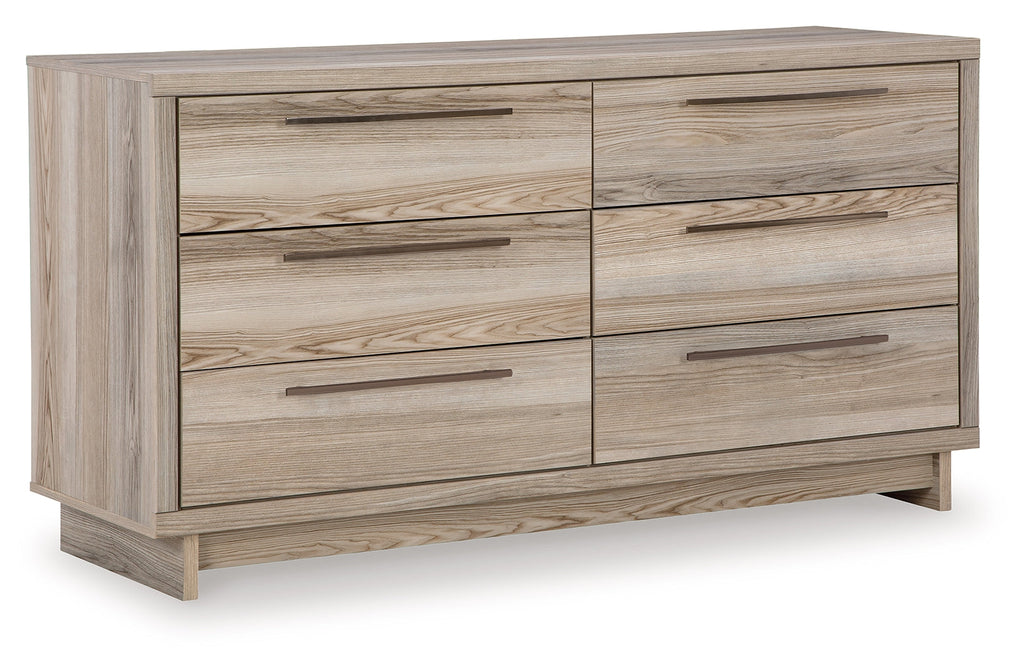 Modern meets neutral and sophisticated in this dresser. Its natural finish, subtle replicated wood grain and clean lines wake up your bedroom with eye-catching appeal. The generous storage space in its smooth-gliding, lined drawers brings function to relaxed refinement. Elongated handles in a champagne tone speak casual simplicity, creating a smart and stylish bedroom retreat.