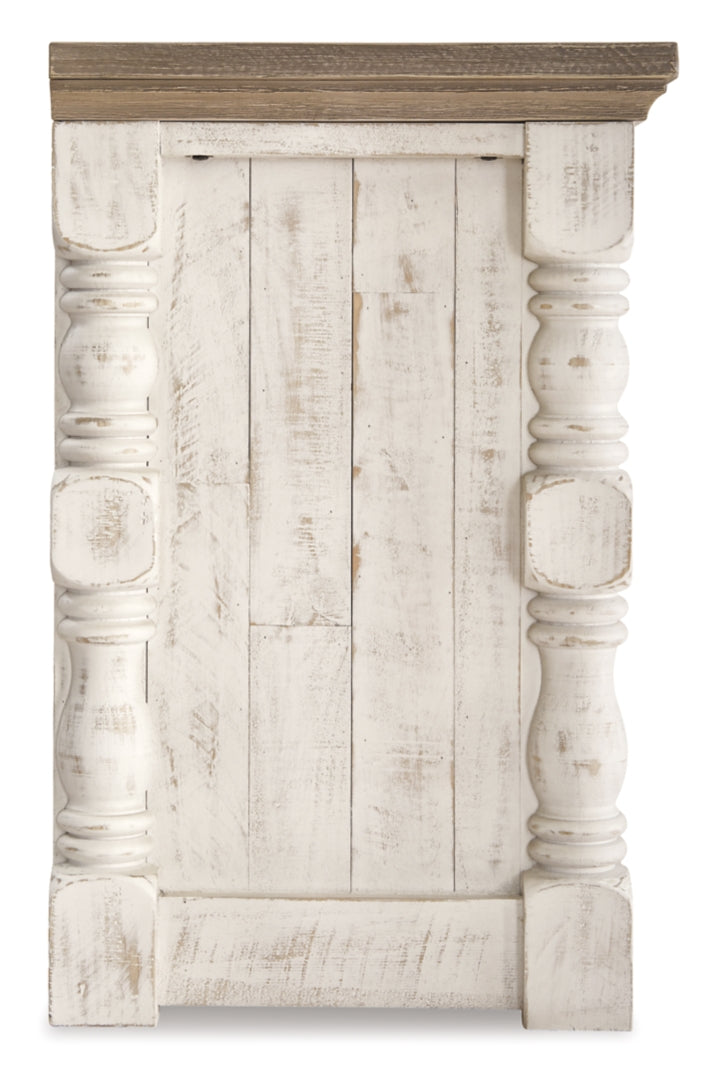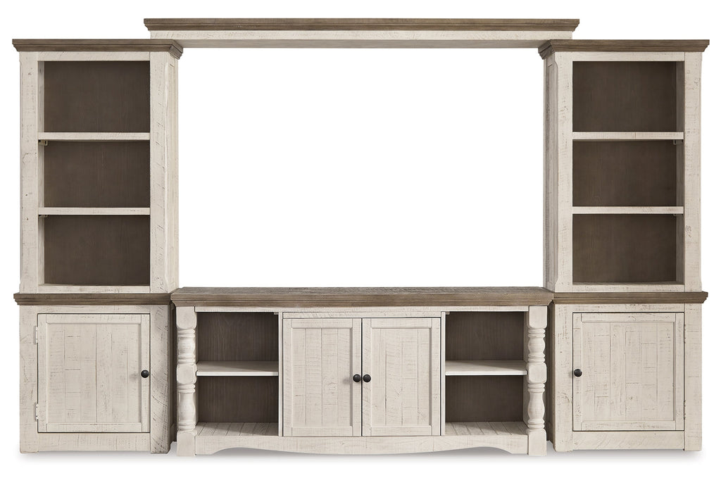 Set your sights on modern farmhouse style with this entertainment center. Distressed two-tone treatment blends a weathered gray with vintage white for an utterly charming effect. Turned posts lend a hearty, substantial look that feels right at home, while plenty of open shelving makes the aesthetic anything but heavy.
