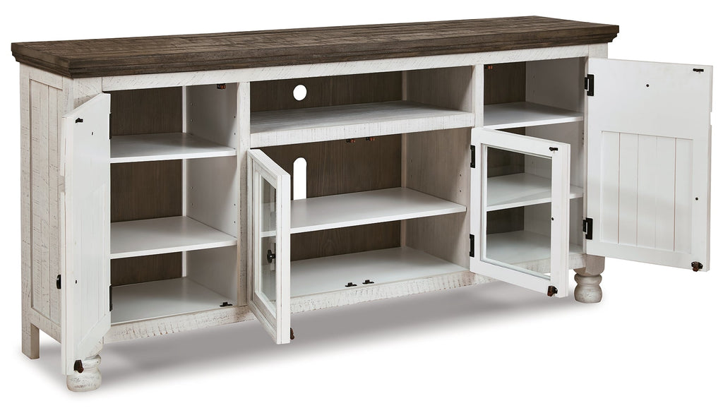 Have your fill of modern farmhouse style with this TV stand. Its distressed two-tone finish pairs a vintage white with a weathered gray for a look that’s utterly charming. Right and left cabinets open to reveal adjustable shelving for all your entertainment center storage needs. Center glass doors add to its relaxed appeal.