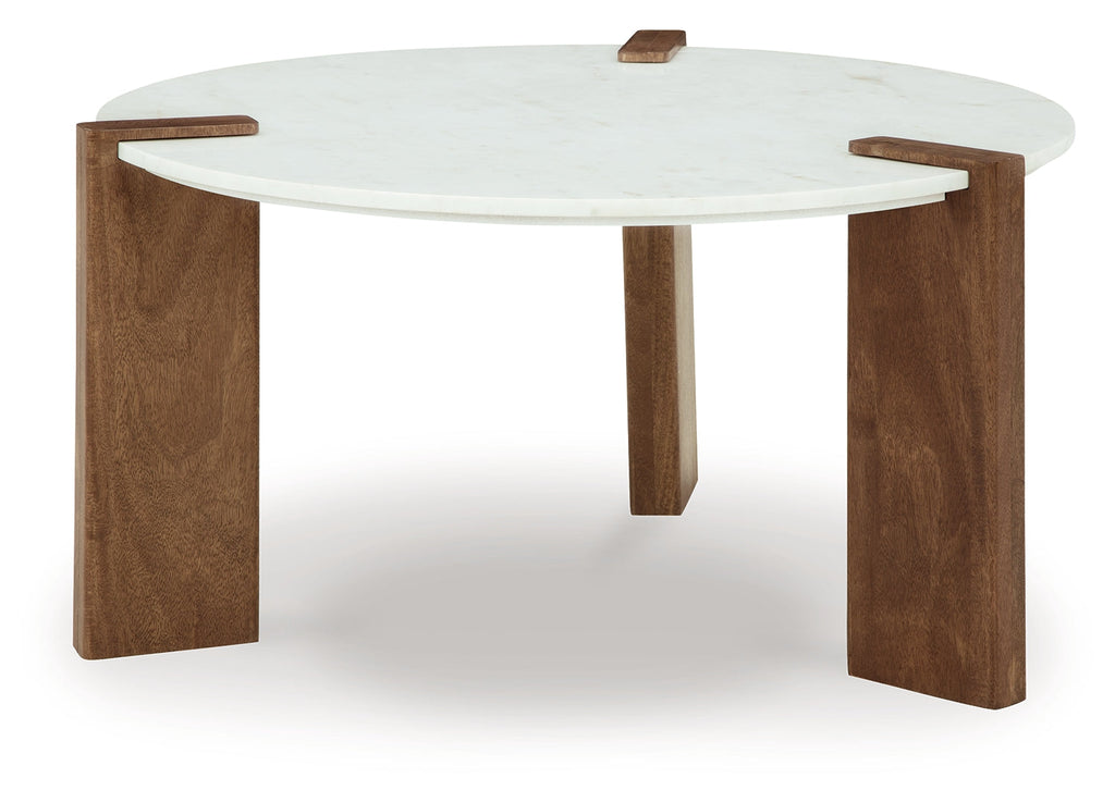 With its back-to-nature sensibility, this occasional table set is a natural fit for outfitting your modern living area. Its clean-lined design lets the beautifully organic quality of the mango wood shine through, complemented by the sleek refinement of marble tops.