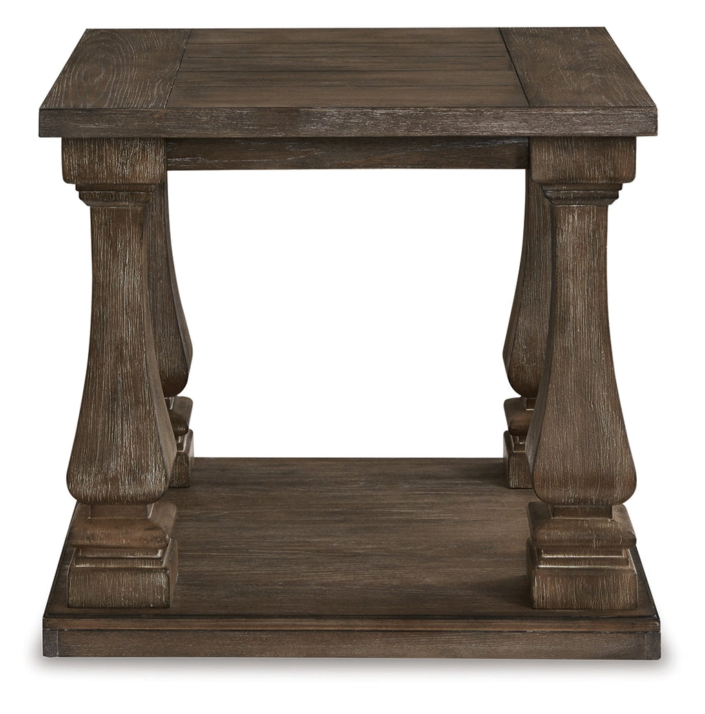 Homey. Hearty. Heavenly hued. Luring with a distressed weathered gray finish and square baluster legs set on a broad lower shelf for great presence, the Johnelle end table is sure to make your homestead feel that much more like home. The look is beautified with elm veneers and a framed and plank-effect tabletop for a richly crafted masterpiece made for years of satisfaction.