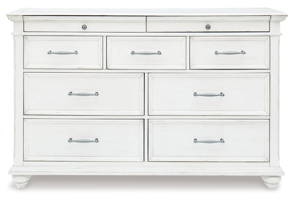 Give your retreat vintage charm and valuable drawer storage with this dresser. In a beautifully distressed whitewash finish, you'll love putting it all away in casual style. Seven full-sized drawers and two accessory top drawers will easily accommodate your needs. Generously scaled moulding from top to bottom, along with bun feet and drawer handles with a transitional aesthetic, give this dresser character—evoking the feel of a quaint cottage escape.
