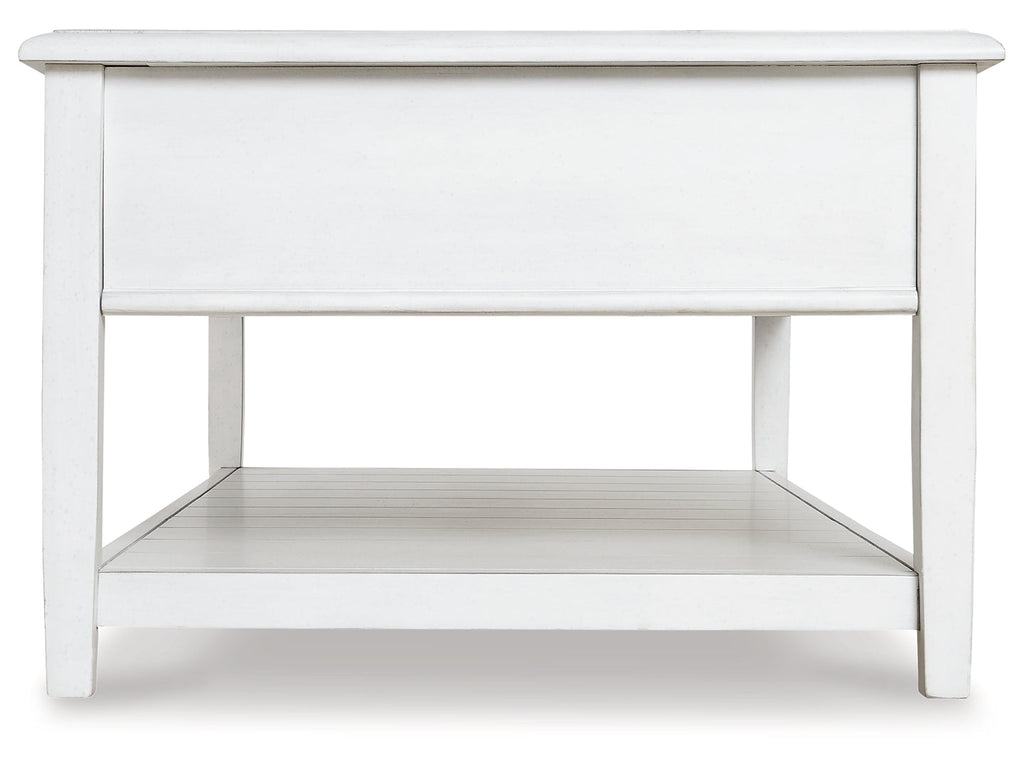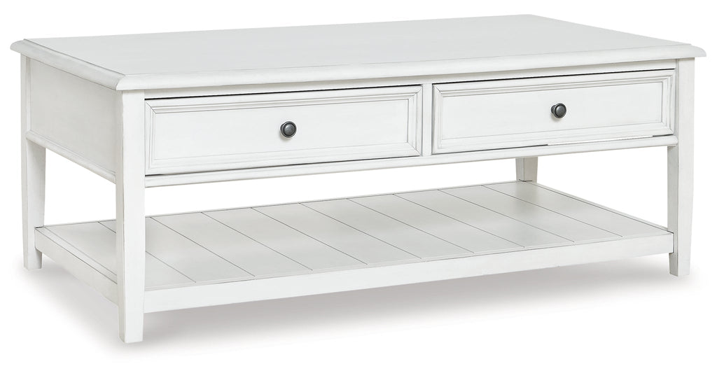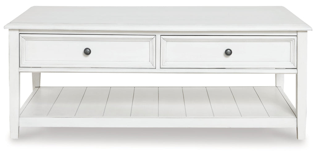Give your home vintage charm and valuable storage with this stunning coffee table. In a beautifully distressed whitewashed finish, two drawers and a roomy display shelf will help you keep chairside essentials nearby in casual style. Simple farmhouse design evokes the feel of a quaint cottage escape.