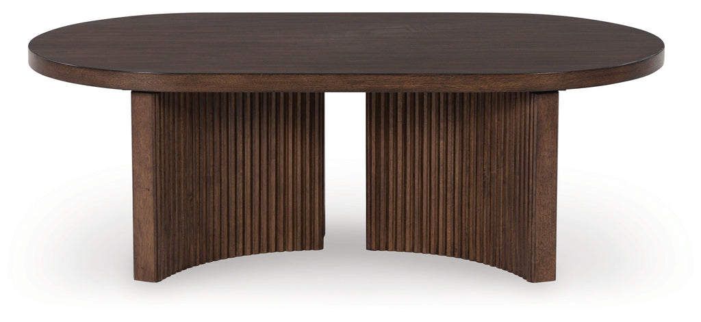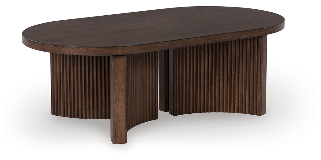 This coffee table exemplifies casual contemporary design with an urban vibe. Its rich brown finish is warm and inviting, and decor looks that much sleeker when displayed on the thick tabletop. A trend-right reeded base subtly nods to mid-century modern design. What a stunning reflection of your simple-meets-elegant sensibility.