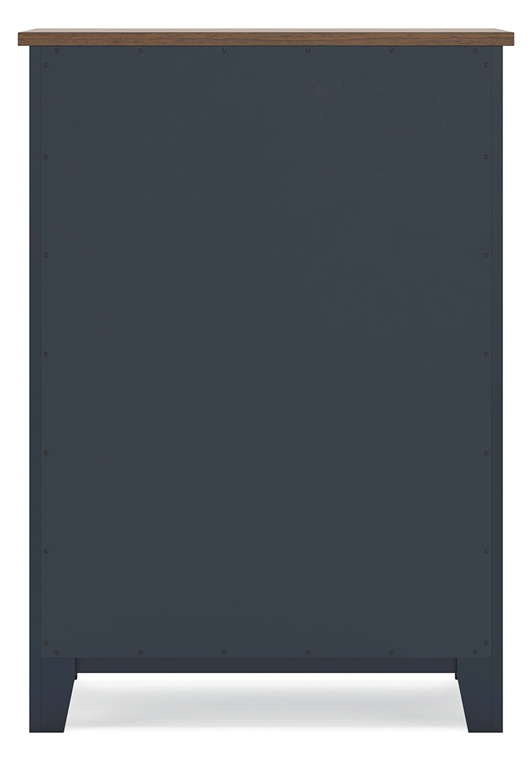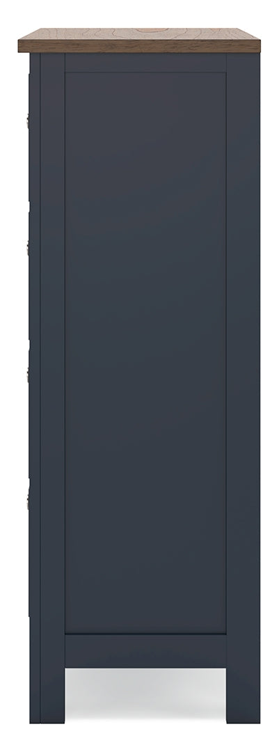 Add homespun charm to your restful retreat. A modern take on a timeless silhouette, this chest of drawers pairs a dark slate blue finish with a light brown top. Drawer fronts and legs in a classic Shaker style bring an air of beautiful simplicity to the bedroom. Whether it's part of a charmingly curated guest suite or a casually carefree kids room, this chest is a welcome addition.