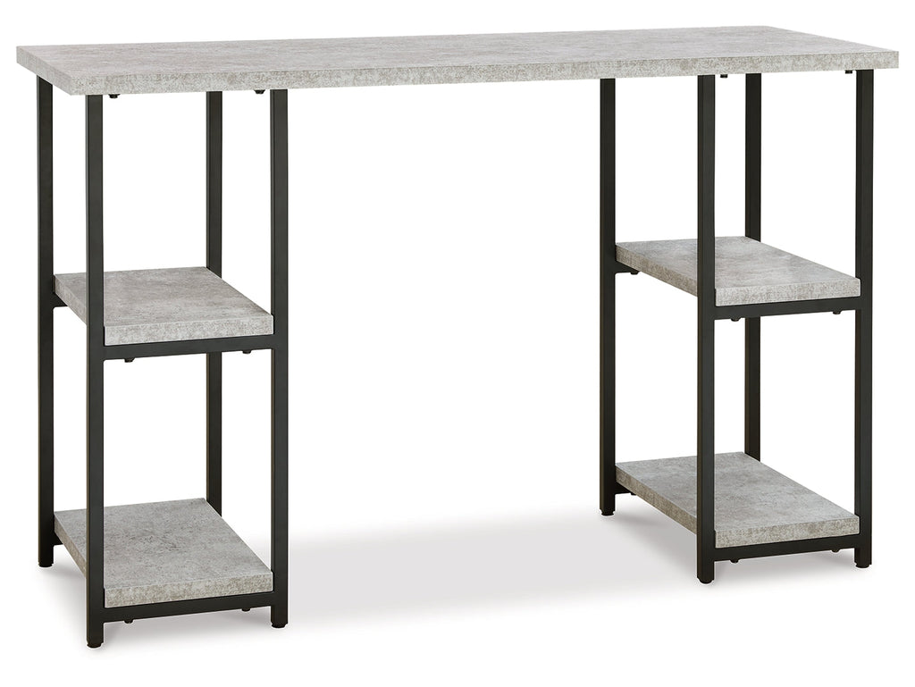 Casual linear style is ideal to keep your home office aesthetic appealing and clean. This desk features an architectural look with its faux concrete melamine top and a metal base in a dark pewter-tone finish, for the perfect balance of crisp and cool. The double-shelf pedestal design offers additional storage space. Melamine is an increasingly popular choice for table surfaces. It can be manufactured to resemble wood grain but with kid-friendly durability.