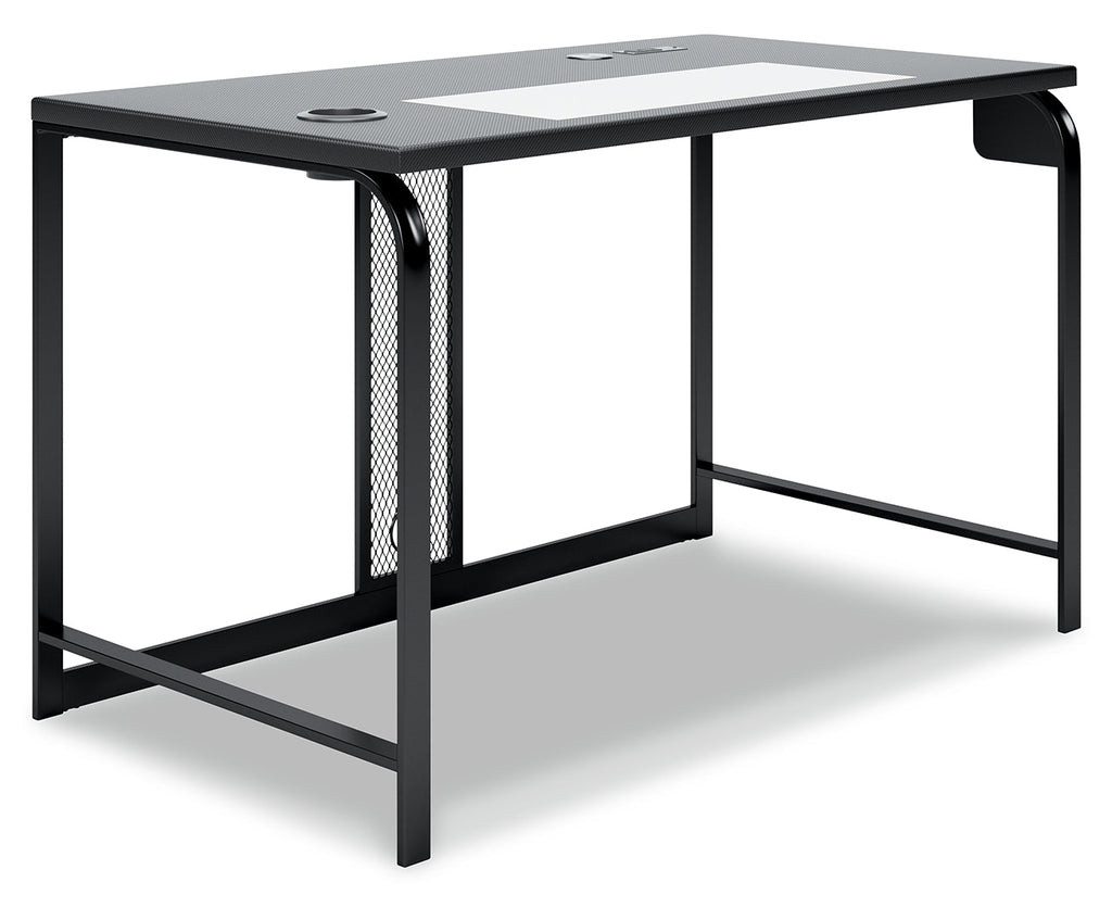 Ultra mod. Work smarter—and look cool doing it—with the new-age efficiency of this desk. Its streamlined design is accented with a tech-inspired decorative laminate surface and PVC insert for mouse tracking. This super sleek yet fully loaded home office desk includes a raised monitor stand with LED ambient lighting, a headset hanger conveniently mounted on the side and a mesh modesty panel underneath for managing all your cords. And with an integrated cup holder, wireless Qi charger and 110V power supply with dual USB ports for charging all your devices, this desk really is designed to keep you up and running.