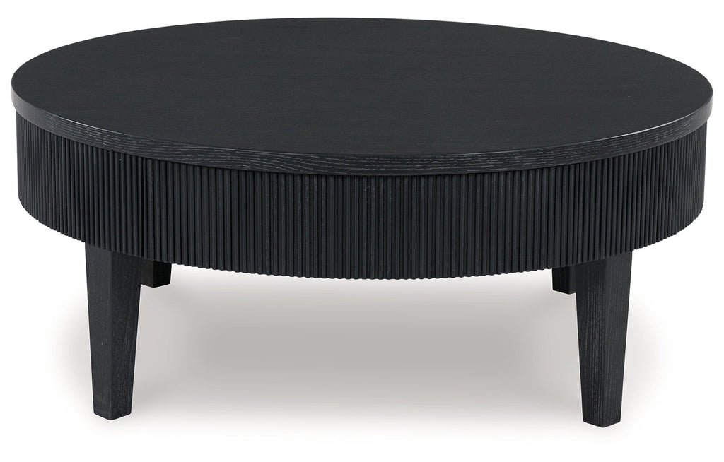 Classic and cool in dark charcoal, this coffee table brings contemporary convenience to your living room. Short on storage? The trendy reeded apron conceals a drawer perfect for remotes, controllers and other entertainment accessories. What a perfect marriage of style and functionality.