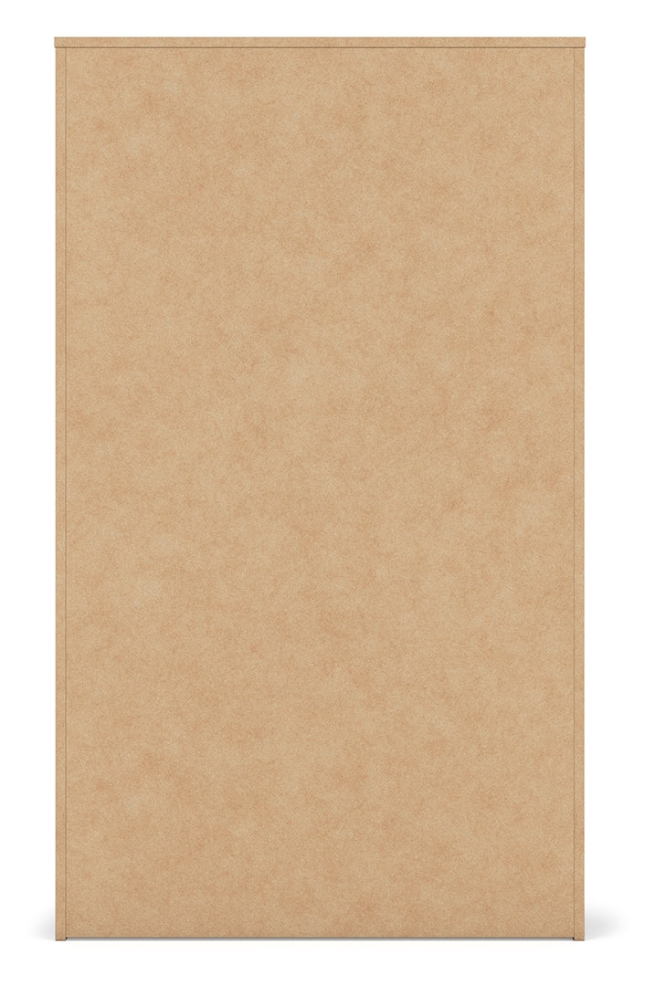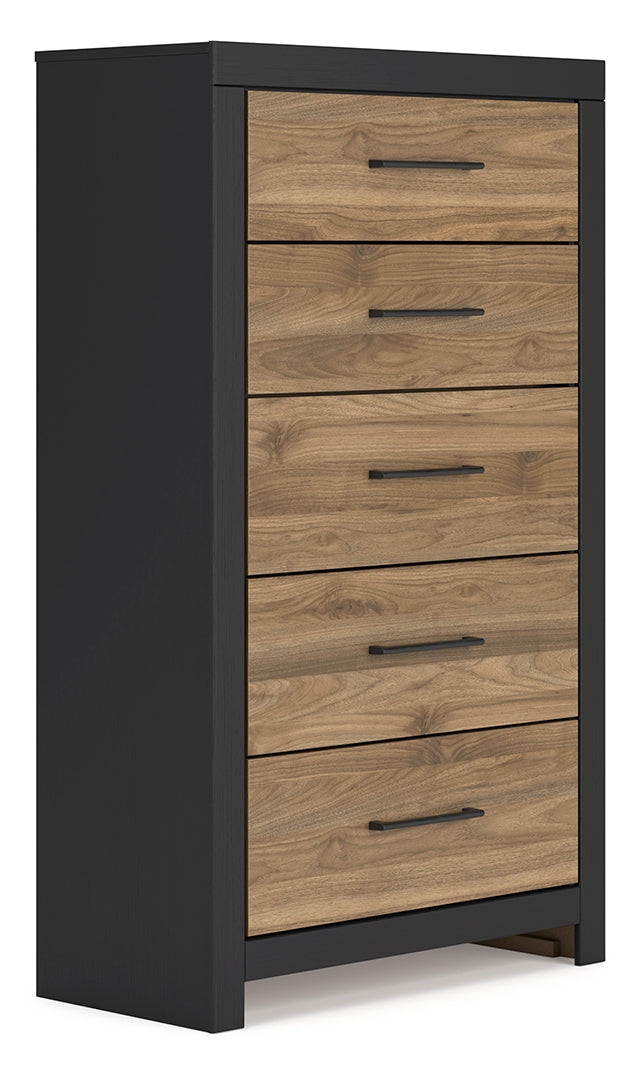 Relaxed yet striking, this chest of drawers brings casual beauty and function to your dream destination. You're sure to love its spacious drawers that glide open and offer plenty of storage for your wardrobe and spare bed linens. A delightful two-tone treatment blends a fresh replicated walnut grain with a matte black finish, while sleek handles in an antiqued gunmetal finish lend a contemporary touch.