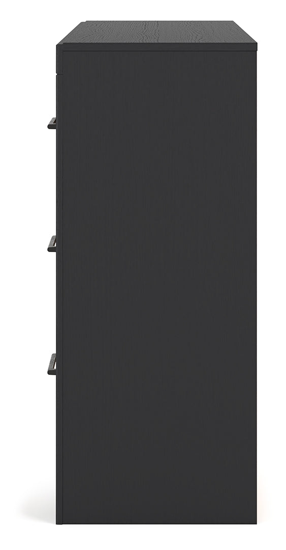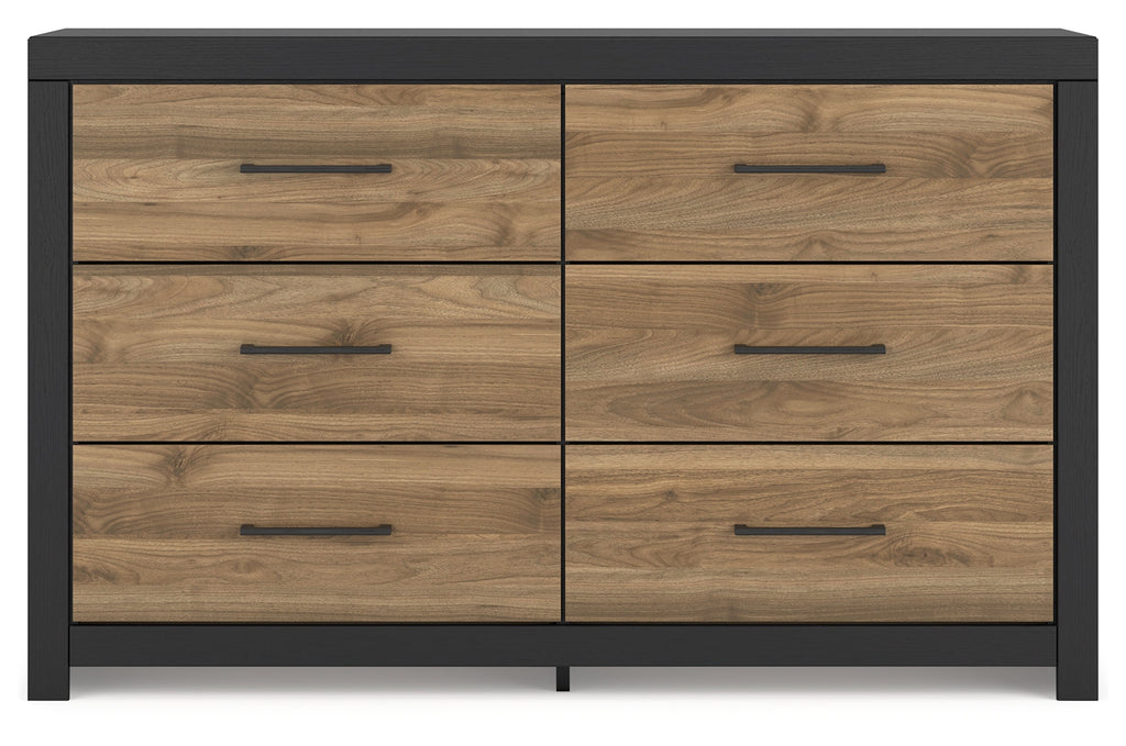 Relaxed yet striking, this dresser brings casual beauty and function to your dream destination. You're sure to love its spacious drawers that glide open and offer plenty of storage for your wardrobe and spare bed linens. A delightful two-tone treatment blends a fresh replicated walnut grain with a matte black finish, while sleek handles in an antiqued gunmetal finish lend a contemporary touch.