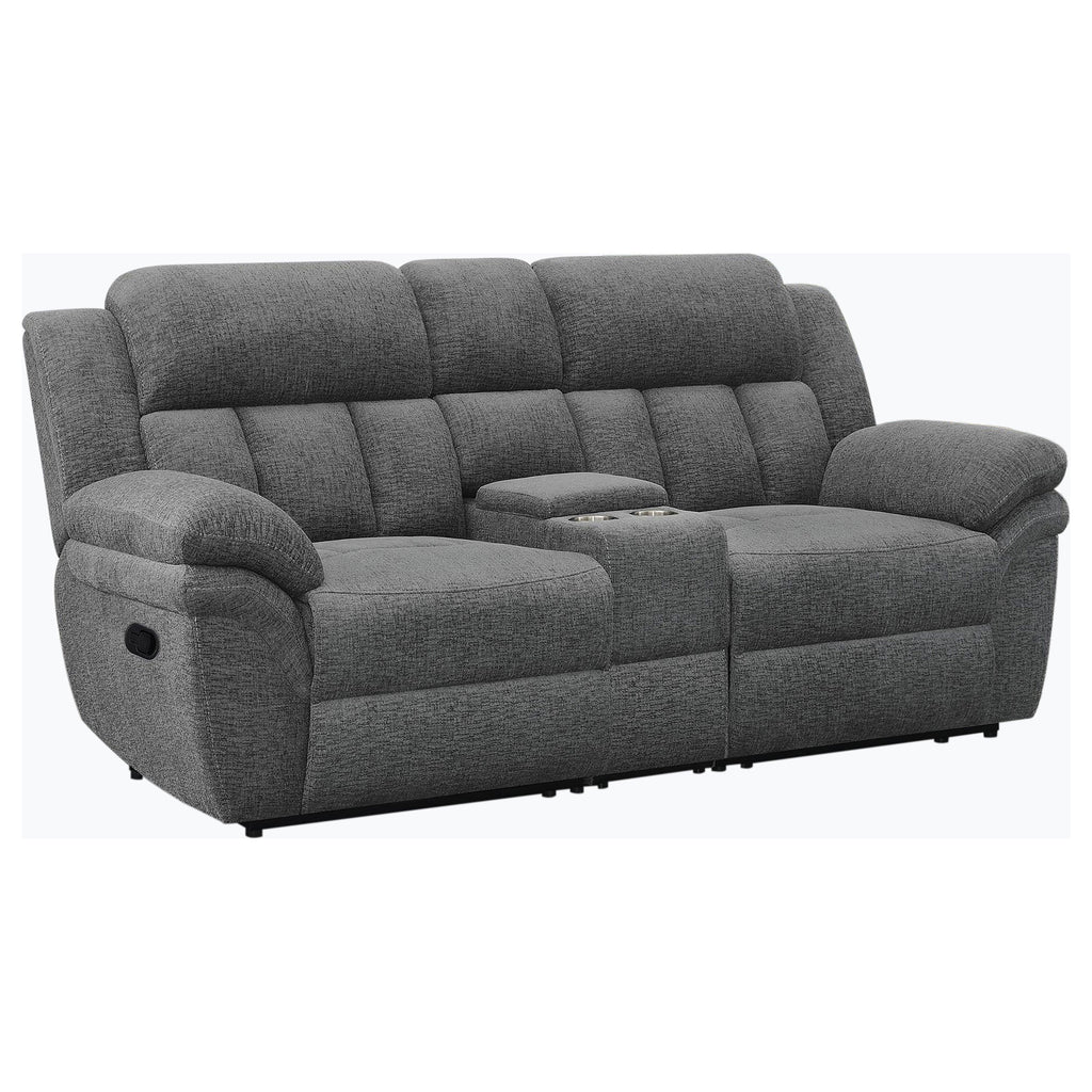Create the perfect retreat from the world, prioritizing comfort with this transitional reclining loveseat. Charcoal upholstery is smooth and soft, creating a stylish addition to your living room or den. Between the recliners is a center storage console with a compartment for accessories and essentials and a pair of cupholders to keep beverages within reach. Supportive seating is paired with plush cushions, offering exceptional comfort and relaxation for movie marathons and catching up with the family. Pillowtop armrests are a lush finishing touch, adding inviting comfort when curling up or kicking back.