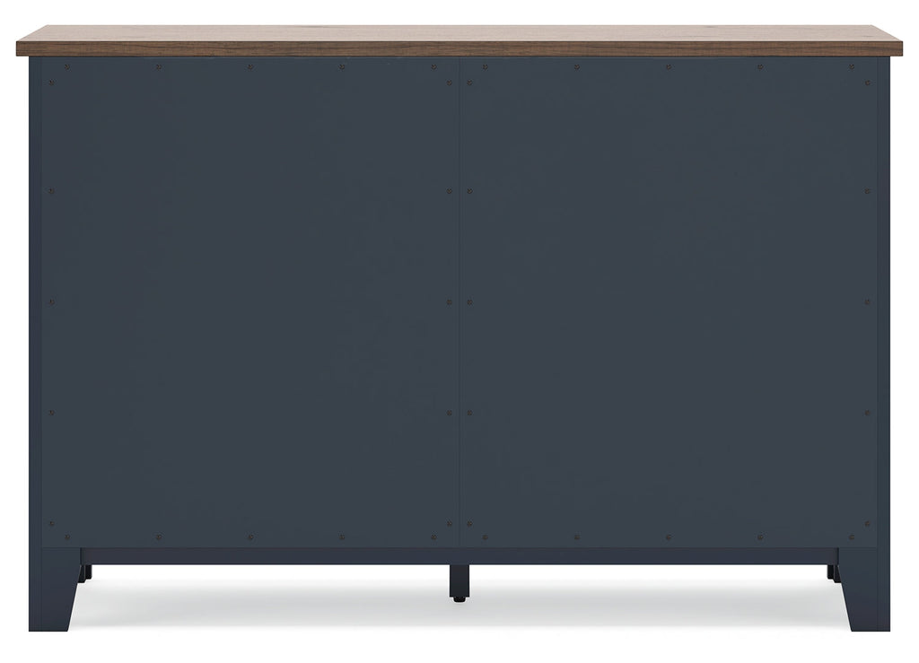 - Two-tone finish features a dark slate blue with a light brown wood-tone top
