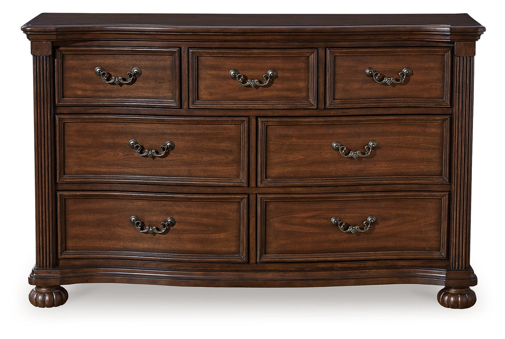 Take inspiration from the traditional luxury of this bedroom package. Classic with a rich cherry brown finish, its stately presence graces your room with an air of opulence. Stunning decorative details add an exquisite touch. Your restful retreat has never been so refined.