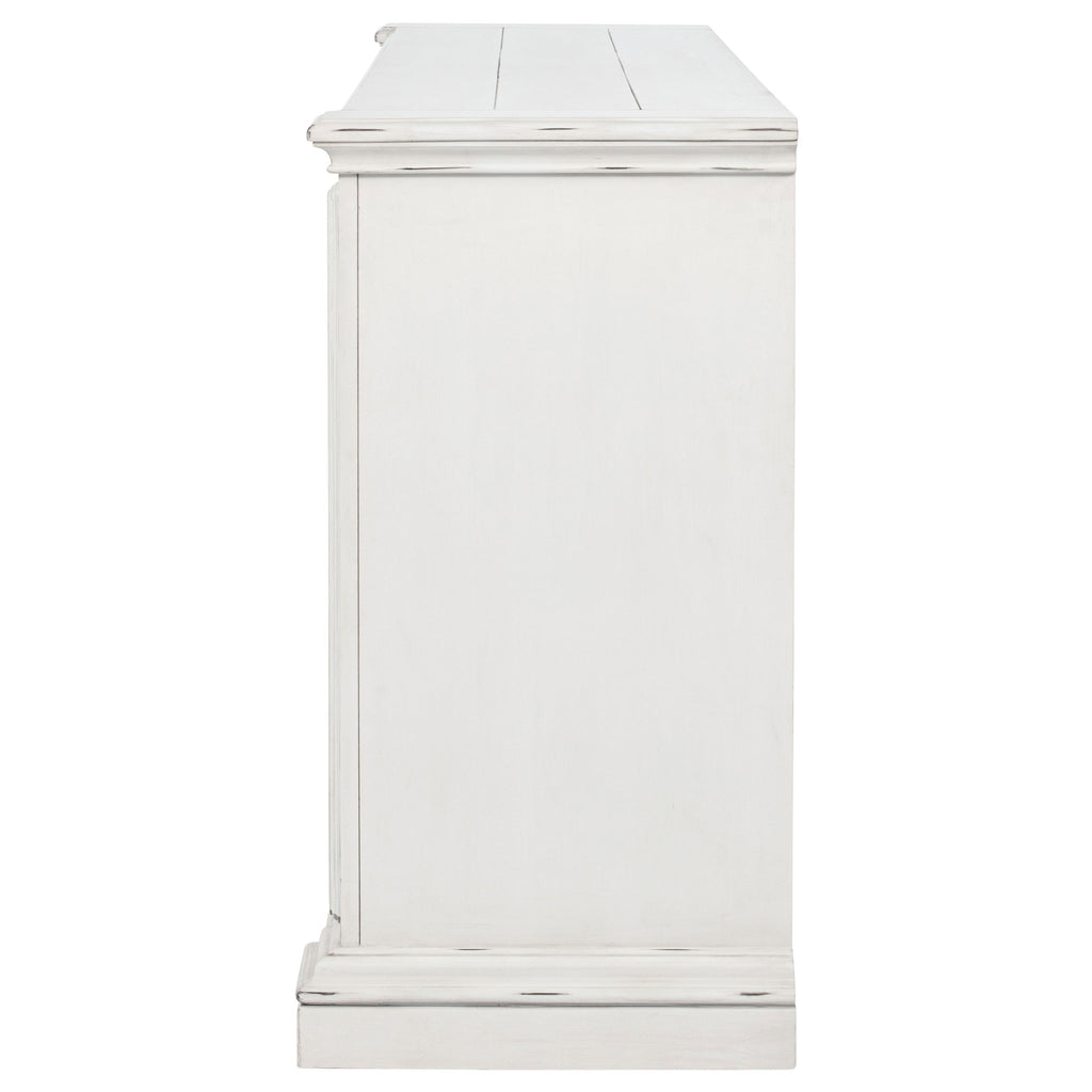 Classic and composed, this six-drawer dresser blends traditional design with elegant practicality. Its vintage white finish is gently distressed, accentuating ornate trim and antique bronze drawer pulls. A hidden jewelry tray tucked into the bottom drawer adds a thoughtful touch, while spacious drawers offer smooth functionality. Crafted from poplar and engineered wood, it brings heritage-inspired charm to any bedroom.