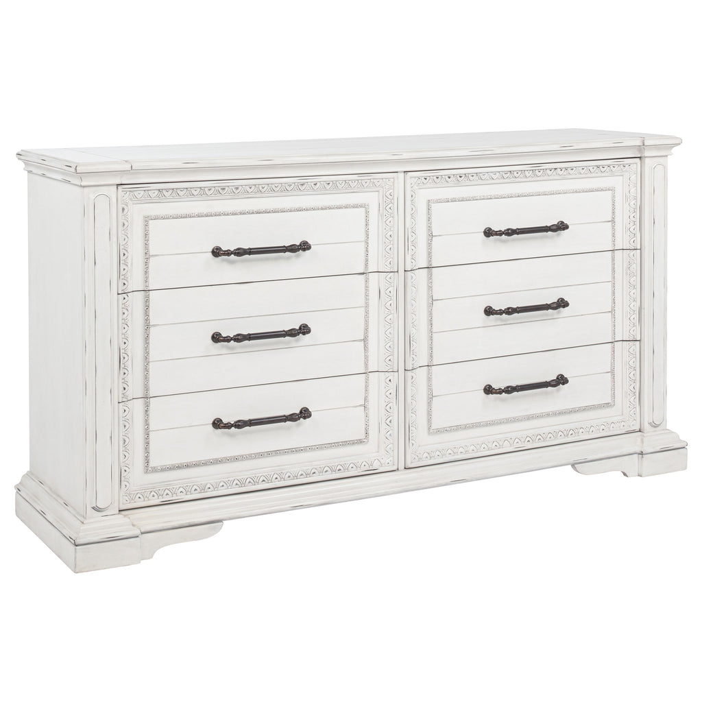 Steeped in elegance and shaped by thoughtful detail, this bedroom set captures the charm of timeless design. Crown moldings and carved accents highlight each piece, softened by a vintage white finish that whispers of age and grace. Hidden features like dual reading lights and jewelry trays offer modern convenience, while traditional construction ensures lasting durability. Crafted from poplar and engineered wood, the set brings classic character to restful spaces.