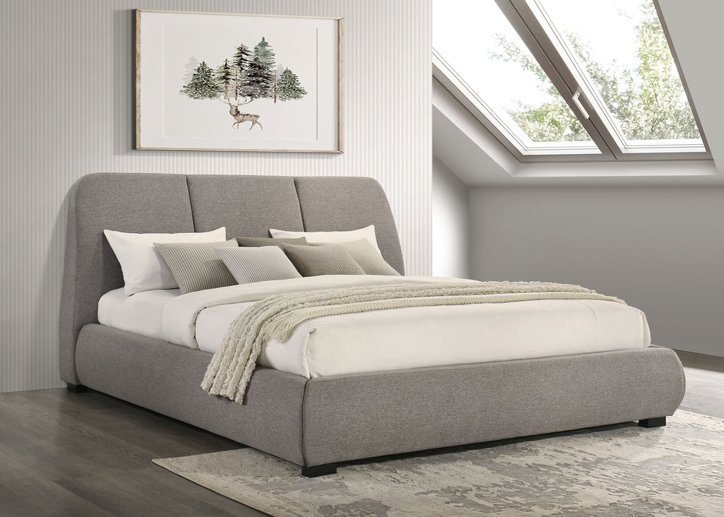 Softly sculpted and thoughtfully tailored, this upholstered platform bed brings a quiet elegance to modern sleep spaces. Its curved silhouette flows from a gently flared headboard to rounded side rails, offering a sense of movement and ease. Three stitched panels add subtle dimension, while the built-in slat system provides durable mattress support without the need for a foundation. Crafted from solid and engineered wood, it balances sculptural form with everyday comfort.