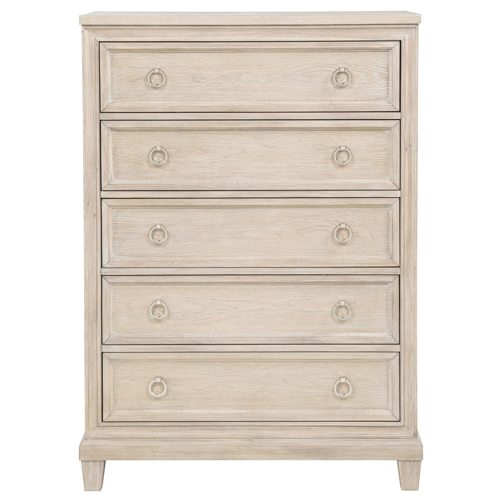 Rooted in timeless grace, this five-drawer chest evokes the quiet elegance of a well-appointed retreat. Gently stepped trim and soft ring-pull hardware lend a sense of heritage, while the washed oak finish whispers of sun worn wood and airy calm. With generous storage hidden behind its refined facade, this piece offers both beauty and intentionÑcrafted to hold lifeÕs essentials while elevating the rhythm of everyday living.