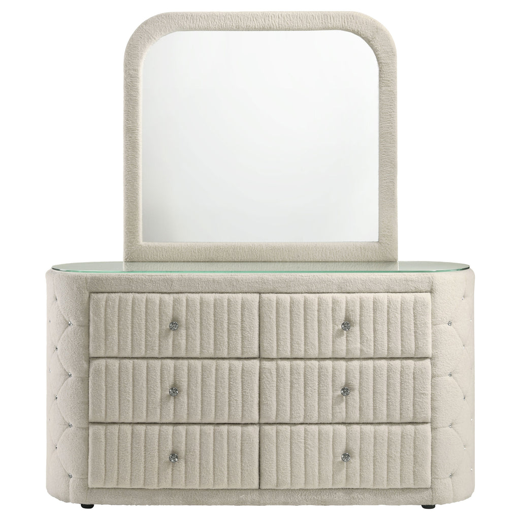 Dresser and mirror set features plush boucle upholstery in a soft ivory tone throughout