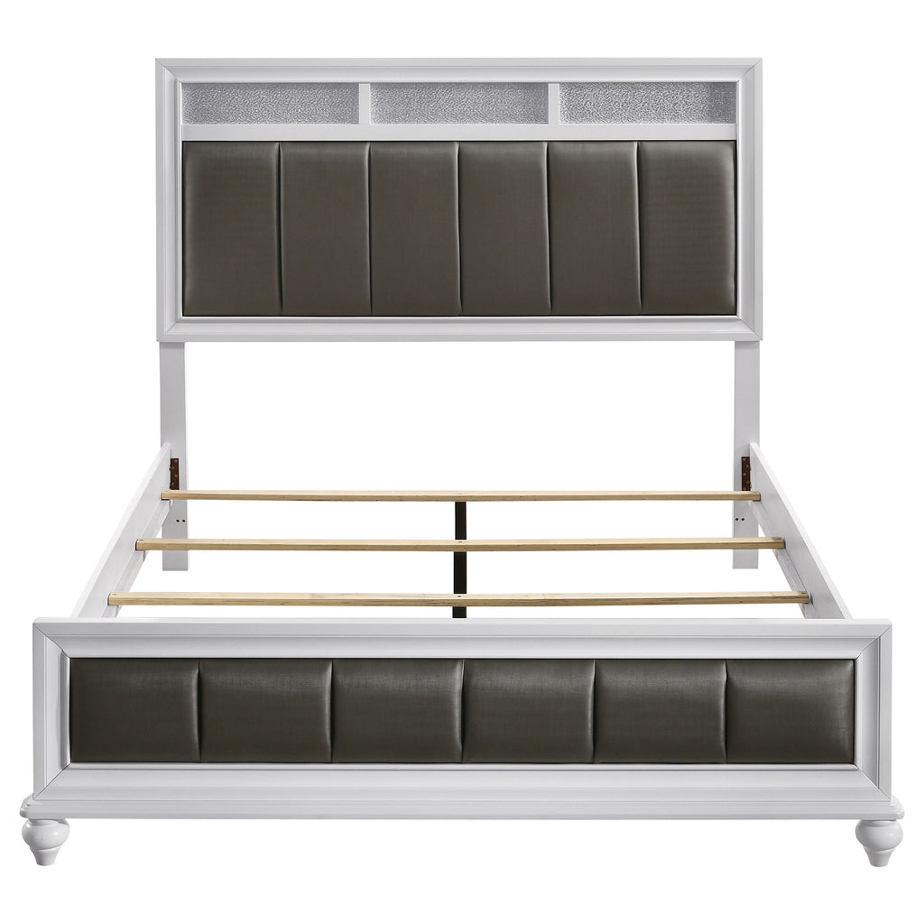 - Fabric Color: Metallic - Wood Finish: White - Hardware Finish: Chrome - Upholstery: Leatherette - Fabric Content: Polyvinyl Chloride 70%, Cotton 20.3%, Polyester 8.7% & Polyurethane 1% - Clean Code: W - Number of Pieces: 4 - Size: Queen - Foundation Required: Yes - Overall Weight Limit: 600 Lbs - Drawer Weight Limit: 45 Lbs - Tipover Restraint: Yes - Assembly Required: Yes - Materials: Acrylic, Foam, Laminated Veneer Lumber (Lvl), Leatherette, Medium Density Fiberboard (Mdf), Okume Veneer, Particle Board (Pb), Rubberwood