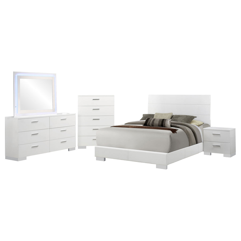 Includes: One (1) California king bed, one (1) nightstand, one (1) dresser, and one (1) dresser mirror