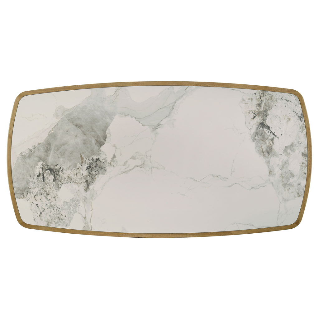 Rectangular dining table with ceramic inset top and mid-century inspired frame silhouette